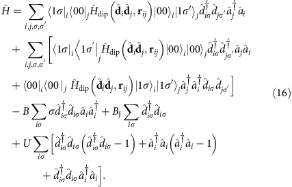The first term in the Hamiltonian (16) is responsible for moving angular-momentum excitations from site to site; the angular-momentum state |1σ〉i can be transferred by the dipole–dipole interactions from site i to another state |1σ′〉j on site j that initially was in the J=0 state. The terms in the second sum in equation (16) change pairs of sites i and j from the J=0 to J=1 angular-momentum states or vice versa. The term ∝B is the Zeeman energy. The term ∝BJ accounts for the internal rotation (internal levels) of the particles. The terms ∝U=∞ in equation (16) enforce the hard-core constraints for the bosons created by the operators