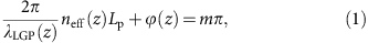 , with a reflection phase ϕ23,24, and mode order m=3 in our case. The effective index for each z is calculated using a corresponding input eigenfrequency of ωLGP(z) determined at the same gap size from the 3D calculations. The LGP resonators are specifically designed to operate in the spectral region near 780 nm using this higher order mode, which has reduced coupling to radiation compared with the fundamental, and, therefore produces large quality factors. Given numerically calculated values for neff(z) and λLGP(z), the gap-dependent reflection phase ϕ(z) is calculated using equation (1). It is important to note that the pNEMS can support hybrid dielectric-loaded surface plasmon travelling modes propagating parallel to the pad surface and through the effective waveguide formed by the SiNx beams. While small coupling to these modes must be contributing to the overall small radiation loss from our resonators, for the parameters used for our devices, such modes are not forming standing wave resonances strong enough to hybridize with the LGP and alter is spectral behaviour.