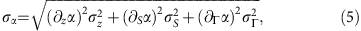 where ∂iα and σi are partial derivatives and uncertainties for i=zrms, S, Γ with