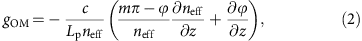 Using the explicit gap-dependence of λLGP, neff and ϕ, we can derive a semi-analytical result for the optomechanical coupling strength gOM≡∂ωLGP/∂z∝∂λLGP/∂z of the pNEMS. This parameter measures the strength of the interaction between the plasmonic and mechanical resonances in the pNEMS, and has a critical role in determining the ultimate transduction gain when using the pNEMS as a motion sensor. From equation (1) we find