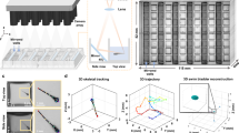 The system loads fixed or anaesthetized larvae from multiwell plates or reservoirs and positions them inside an ultrathin borosilicate glass capillary tube located under the field-of-view of a microscope through the use of a computerized syringe pump9,10 (Fig. 1b). We have previously demonstrated ultrathin borosilicate glass to be an excellent capillary material due to its low autofluorescence and optical distortion9. A three-axis linear stage positions the loading nozzle and the computerized syringe pump aspirates the larvae into a flexible tube connected to the glass capillary. The larvae are automatically detected and positioned under the field-of-view as previously described9,10. The capillary is held by two stepper motors with hollow shafts that rotate it around its longitudinal axis. The capillary is immersed in water for refractive index matching between the inside and outside of the tube. The stepper motors rotate the capillary at a predefined speed while a high-speed camera acquires images at multiple angles. The rotation speed and timestamps assigned to each image frame are used to precisely calculate the angle of rotation of capillary at each frame.