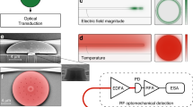 The μFOM resonator is placed in close proximity (<1 μm distance) to tapered optical fibre25,26 (as shown in Fig. 1c), such that evanescent coupling from the taper allows light to be introduced and extracted from the optical WGMs of the device. A CW fibre-coupled tunable 1.5 μm laser is used as the source (Newfocus TLB-6328), and a fibre-coupled high-speed photodetector is used to monitor vibration. Mechanical vibration is stimulated within the device by pumping-specific optical resonances where the three-mode phase-match exists. The internally generated Stokes-shifted laser is then also collected by the tapered fibre, and the temporal interference of this new Brillouin laser against the partially transmitted pump laser is used to infer the mechanical response using the photodetector12,13. An optical spectrum analyser is used to verify that four-wave mixing and Raman scattering are not responsible for the beat note observed in the electrical spectrum.