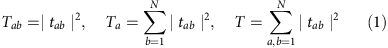 The transmittance Tab, for a given incident mode a and outgoing mode b, gives rise to a speckle pattern in the transmitted intensity. The transmittance Ta is the total transmission (for the incident mode a), and thus represents the apparent brightness of the speckle pattern. The transmittance T is the classical analogue of the dimensionless conductance g26,27.