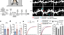 All experimental procedures were performed in compliance with the institutional guidelines of the University of Tokyo. Male or female wild-type ICR (Fig. 1) and C57Bl/6J (Fig. 2) mice (Japan SLC, Inc.) were used for in vivo imaging (see Supplementary Tables 1–7 for the number and ages of animals in each experiment). The following ASD mouse models were used in this study: patDp/+ mice with paternal duplication of chromosome 7c24, NLG R451C mice with a point mutation corresponding to the human NLGN-3 R451C15 and BTBR T+tf mice43. Constructs of PSD-95-GFP were previously described34,61. An expression plasmid of DsRed2 was constructed by replacing the cDNA sequence from pDsRed2-N1 (Clontech) with GFP of pAct-GFP. An expression plasmid for gephyrin-GFP was constructed by inserting the gephyrin-GFP fragment62 into the pCAGGS vector. PSD-95-GFP and DsRed2 were expressed under the control of the β-actin promoter, and gephyrin-GFP was expressed under the control of the CAG promoter.