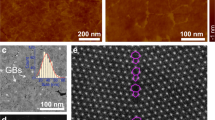 Graphene GBs were synthesized on copper foils (from Alfa Aesar, product no. 46365) by the CVD process at ambient pressure9,10. At first, copper foils were treated for 10–20 min in hydrochloric acid (10% diluted in deionized water) and rinsed properly in acetone and isopropanol followed by drying in argon (Ar) gas flow to clean the surface. The cleaned samples were immediately loaded into the CVD chamber. After loading the samples, first, the CVD chamber was evacuated (down to 1 mtorr) and then purged with forming gas (5% hydrogen diluted in Ar) up to the atmospheric pressure. The samples were heated up to 1,050 °C in protection of forming gas and annealed for 60 min. Annealing in H2 helps in improving the Cu surface quality by reducing the concentration of nucleation points. Finally, the graphene growth was carried out by introducing 20 p.p.m. of methane (CH4) for a precisely controlled time (for example, 50 min) to obtain the desired grain size and surface coverage. The samples were then rapidly cooled down to room temperature in protection of forming gas and carefully taken out for further procedure.