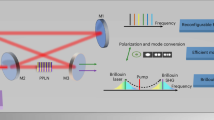 A schematic of the basic set-up of the experiment is shown in Fig. 6. A narrow linewidth laser at 1,550 nm with a bandwidth of 500 kHz was used as a pump source for the enhancement as well as the suppression experiments. The CW laser light was carved into 400 ns pulses with a repetition rate of 40 kHz using a Mach–Zehnder modulator driven by a function generator. The bandwidth of the coupled laser light was, therefore, determined by the pulse length and was around 2.3 MHz. The pulses were much longer than the transit time of 550 ps for the chip. Operating in a quasi-CW regime allowed high peak power levels in the waveguide while keeping the average power low. Therefore, we are able to observe strong SBS without accumulative heating of the waveguides, which prevented waveguide damage. An erbium-doped fibre amplifier was used to amplify the laser pulses before coupling to the chip, and a polarization controller (PC) allowed the coupled light to be in the transverse electric (TE) mode, which is the lowest loss mode of the waveguide. The light was coupled into the waveguide using lensed fibres with a focal spot diameter of 2 μm and a measured fibre-to-fibre coupling loss of 2.5 dB. Overall the insertion loss of the 6.8 cm long rib waveguide was 10 dB, which was permanently monitored during the experiment using a 99/1 coupler at the waveguide input and output connected to a dual-channel power meter. The refractive index of the guiding material was 2.43 leading to a maximum feedback of 17% from the cleaved facets because of the index mismatch to the surrounding air. The waveguide output was monitored with an optical spectrum analyser with 8 pm resolution.