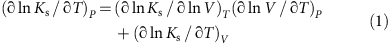 where χP is the Pauli paramagnetic susceptibility and PF is the probability density of an electron wave function at the nucleus averaged over states at the Fermi level EF46,47. χP can be chosen as the volume susceptibility and electron wave function is then normalized over the unit volume. It is of note that direct numerical calculation of Ks requires knowing the precise value of the electron wave function at the nucleus and the calculation of the precise value of the Knight shift in metallic alloys by density-functional theory remains very challenging48,49. However, the importance in the current study is not the absolute value of Ks but its temperature dependence. The Ks(T,V) is a function of the density (or the volume V with a constant number of atoms) and T. Since V is a function of T and pressure P, we have Ks(T,V(T,P)) Therefore, the following thermodynamic relation holds50