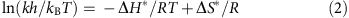 where T0 is an arbitrarily selected reference temperature, KA0 is the association constant at temperature T0, and ΔH0 is the van’t Hoff enthalpy at temperature T0. ΔCp is the temperature-independent heat capacity change (constrained to the experimentally determined values of −359 and −172 cal mol−1K−1 (Supplementary Fig. 7) for the analysis of PDA and SU5402, respectively) and R=1.986 cal mol−1 K−1. ΔH0 was determined by non-linear fitting of equation (1) to the experimental data using Prism 5.1 (GraphPad Software, Inc, La Jolla, USA). Transition state thermodynamic quantities were determined from the kinetic association (kon) and dissociation (koff) rate constants as previously described64 by plotting ln (kh/kBT) versus 1/T according to the linear Eyring equation (2).