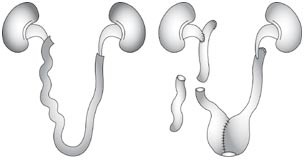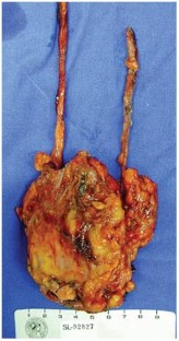 Management Radical cystectomy with total right ureterectomy and distal left ureterectomy. Reconstruction of the urinary tract was performed with the distal ileum detubulized and rearranged in a U shape. A pyeloileal anastomosis and a proximal ureteroileal anastomosis were performed at the right and left sides respectively.