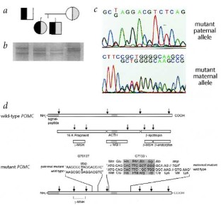 Sequential cleavage of the precursor protein pre–pro–opiomelanocortin (POMC) generates the melanocortin peptides adrenocorticotrophin (ACTH), melanocyte–stimulating hormones (MSH) α, β, and γ as well as the opioid–receptor ligand β–endorphin1. While a few cases of isolated ACTH deficiency have been reported (OMIM 201400), an inherited POMC defect has not been described so far2. Recent studies in animal models elucidated a central role of α–MSH in the regulation of food intake by activation of the brain melanocortin–4–receptor (MC4–R; refs 3, 4, 5) and the linkage of human obesity to chromosome 2 in close proximity to the POMC locus6, led to the proposal of an association of POMC with human obesity7.The dual role of α–MSH in regulating food intake and influencing hair pigmentation predicts that the phenotype associated with a defect in POMC function would include obesity, alteration in pigmentation and ACTH deficiency. The observation of these symptoms in two probands prompted us to search for mutations within their POMC genes. Patient 1 was found to be a compound heterozygote for two mutations in exon 3 (G7013T, C7133Δ) which interfere with appropriate synthesis of ACTH and α-MSH. Patient 2 was homozygous for a mutation in exon 2 (C3804A) which abolishes POMC translation. These findings represent the first examples of a genetic defect within the POMC gene and define a new monogenic endocrine disorder resulting in early–onset obesity, adrenal insufficiency and red hair pigmentation.