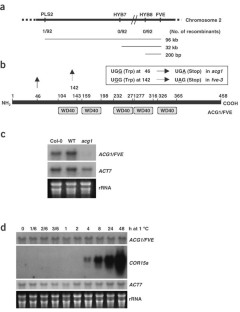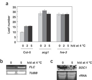 Cold induces expression of a number of genes that encode proteins that enhance tolerance to freezing temperatures in plants1,2. A cis-acting element responsive to cold and drought, the C-repeat/dehydration-responsive element (C/DRE), was identified in the Arabidopsis thaliana stress-inducible genes RD29A3 and COR15a4 and found in other cold-inducible genes in various plants1,5. C/DRE-binding factor/DRE-binding protein (CBF/DREB) is an essential component of the cold-acclimation response1,2, but the signaling pathways and networks are mostly unknown. Here we used targeted genetic approach to isolate A. thaliana mutants with altered cold-responsive gene expression (acg) and identify ACG1 as a negative regulator of the CBF/DREB pathway. acg1 flowered late and had elevated expression of FLOWERING LOCUS C (FLC)6, a repressor of flowering encoding a MADS-box protein. We showed that acg1 is a null allele of the autonomous pathway gene FVE. FVE encodes a homolog of the mammalian retinoblastoma-associated protein, a component of a histone deacetylase (HDAC) complex involved in transcriptional repression7,8. We also showed that plants sense intermittent cold stress through FVE and delay flowering with increasing expression of FLC. Dual roles of FVE in regulating the flowering time and the cold response may have an evolutionary advantage for plants by increasing their survival rates.