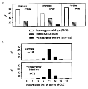 Human mitochondrial DNA polymerase, encoded by POLG, contains a polyglutamine tract encoded by a CAG microsatellite repeat1,2. Analysis of POLG genotypes in different populations identified an association between absence of the common, ten-repeat allele and male infertility typified by a range of sperm quality defects but excluding azoospermia.
