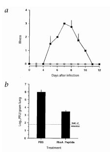 The fusion glycoproteins of human respiratory syncytial virus (RSV) and human parainfluenza virus type-3 (PIV-3) mediate virus entry and syncytium formation. Interaction between the fusion protein of RSV and RhoA, a small GTPase, facilitates virus-induced syncytium formation. We show here a RhoA-derived peptide inhibits RSV and syncytium formation induced by RSV and PIV-3, both in vitro by inhibition of cell-to-cell fusion and in vivo by reduction of peak titer by 2 log10 in RSV-infected mice. These findings indicate that the interaction between these two paramyxovirus fusion proteins and RhoA is an important target for new antiviral strategies.