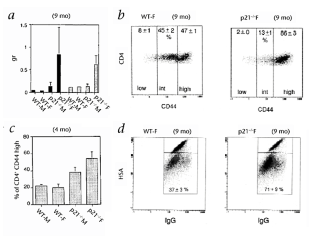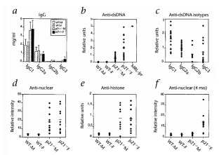 Here we show that the cell-cycle regulator p21 is involved in immune system function. T lymphocytes from p21−/− mice exhibit significant proliferative advantage over wild-type cells following prolonged stimulation, but not after primary activation. Consistent with this, p21-deficient mice accumulate abnormal amounts of CD4+ memory cells, and develop loss of tolerance towards nuclear antigens. Similar to human lupus, female p21-deficient mice develop antibodies against dsDNA, lymphadenopathy, and glomerulonephritis, leading to decreased viability. These data demonstrate a specialized role for p21 in the control of T-cell proliferation, tolerance to nuclear antigens, and female-prone lupus. These findings could be the basis for new therapeutic approaches to lupus.