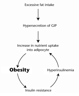 Secretion of gastric inhibitory polypeptide (GIP), a duodenal hormone, is primarily induced by absorption of ingested fat. Here we describe a novel pathway of obesity promotion via GIP. Wild-type mice fed a high-fat diet exhibited both hypersecretion of GIP and extreme visceral and subcutaneous fat deposition with insulin resistance. In contrast, mice lacking the GIP receptor (Gipr−/−) fed a high-fat diet were clearly protected from both the obesity and the insulin resistance. Moreover, double-homozygous mice (Gipr−/−, Lepob/Lepob) generated by crossbreeding Gipr−/− and obese ob/ob (Lepob/Lepob) mice gained less weight and had lower adiposity than Lepob/Lepob mice. The Gipr−/− mice had a lower respiratory quotient and used fat as the preferred energy substrate, and were thus resistant to obesity. Therefore, GIP directly links overnutrition to obesity and it is a potential target for anti-obesity drugs.