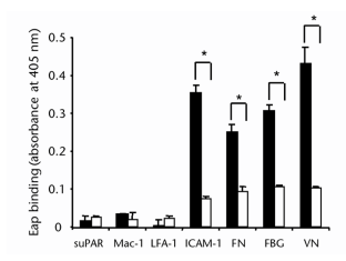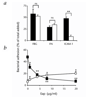Hussain, M. et al. Insertional inactivation of Eap in staphylococcus aureus strain Newman confers reduced staphylococcal binding to fibroblasts. Infect. Immun. in press (2002).