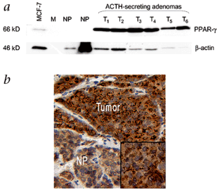 Adrenocorticotrophic hormone (ACTH)-secreting pituitary tumors are associated with high morbidity due to excess glucocorticoid production. No suitable drug therapies are currently available, and surgical excision is not invariably curative. Here we demonstrate immunoreactive expression of the nuclear hormone receptor peroxisome proliferator-activated receptor-γ (PPAR-γ) exclusively in normal ACTH-secreting human anterior pituitary cells: PPAR-γ was abundantly expressed in all of six human ACTH-secreting pituitary tumors studied. PPAR-γ activators induced G0/G1 cell-cycle arrest and apoptosis and suppressed ACTH secretion in human and murine corticotroph tumor cells. Development of murine corticotroph tumors, generated by subcutaneous injection of ACTH-secreting AtT20 cells, was prevented in four of five mice treated with the thiazolidinedione compound rosiglitazone, and ACTH and corticosterone secretion was suppressed in all treated mice. Based on these findings, thiazolidinediones may be an effective therapy for Cushing disease