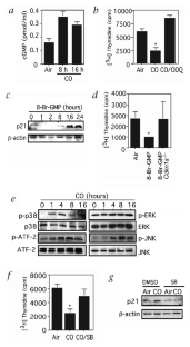 Carbon monoxide (CO), one of the products of heme oxygenase action on heme, prevents arteriosclerotic lesions that occur following aorta transplantation; pre-exposure to 250 parts per million of CO for 1 hour before injury suppresses stenosis after carotid balloon injury in rats as well as in mice. The protective effect of CO is associated with a profound inhibition of graft leukocyte infiltration/activation as well as with inhibition of smooth muscle cell proliferation. The anti-proliferative effect of CO in vitro requires the activation of guanylate cyclase, the generation of cGMP, the activation of p38 mitogen-activated protein kinases and the expression of the cell cycle inhibitor p21Cip1. These findings demonstrate a protective role for CO in vascular injury and support its use as a therapeutic agent.