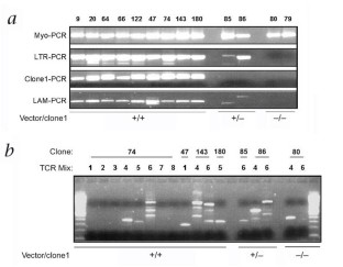 A clinical trial of retroviral-mediated transfer of the adenosine deaminase (ADA) gene into umbilical cord blood CD34+ cells was started in 1993. ADA-containing peripheral blood mononuclear cells (PBMCs) have persisted in patients from this trial, with T lymphocytes showing the highest prevalence of gene marking1,2. To gain a greater understanding of the nature and number of the transduced cells that were engrafted, we used linear amplification–mediated PCR (LAM-PCR) to identify clonal vector proviral integrants3,4. In one patient, a single vector integrant was predominant in T lymphocytes at a stable level over most of the eight-year time span analyzed and was also detected in some myeloid samples. T-cell clones with the predominant integrant, isolated after eight years, showed multiple patterns of T-cell receptor (TCR) gene rearrangement, indicating that a single pre-thymic stem or progenitor cell served as the source of the majority of the gene-marked cells over an extended period of time. It is important to distinguish the stable pattern of monoclonal gene marking that we observed here from the progressive increase of a T-cell clone with monoclonal gene marking that results from leukemic transformation, as observed in two subjects in a clinical trial of gene therapy for X-linked severe combined immunodeficiency (SCID)5,6.
