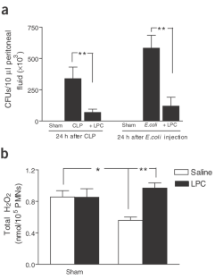 Sepsis represents a major cause of death in intensive care units. Here we show that administration of lysophosphatidylcholine (LPC), an endogenous lysophospholipid, protected mice against lethality after cecal ligation and puncture (CLP) or intraperitoneal injection of Escherichia coli. In vivo treatment with LPC markedly enhanced clearance of intraperitoneal bacteria and blocked CLP-induced deactivation of neutrophils. In vitro, LPC increased bactericidal activity of neutrophils, but not macrophages, by enhancing H2O2 production in neutrophils that ingested E. coli. Incubation with an antibody to the LPC receptor, G2A, inhibited LPC-induced protection from CLP lethality and inhibited the effects of LPC in neutrophils. G2A-specific antibody also blocked the inhibitory effects of LPC on certain actions of lipopolysaccharides (LPS), including lethality and the release of tumor necrosis factor-α (TNF-α) from neutrophils. These results suggest that LPC can effectively prevent and treat sepsis and microbial infections.