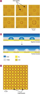 Soft organic surfaces with more and more complex topologies are required daily to engineer appropriate microstructures for many different applications such as DNA array technology1, biological optics for advanced photonic systems2 and microfluidics3,4. Complementarily to conventional lithographic processes5,6, several pioneering methods have been developed recently, by controlling phase separation of polymer blends7,8, spinodal decomposition of homopolymers9,10 or by using the action of additional external forces driving diverse instabilities11,12. Here we present a method that not only provides original concepts towards the three-dimensional (3D) structuring of liquids, on the basis of the synergistic effects of molecular diffusion and confined nucleation, but also suggests original solutions for the transport, mixing and filtering of small volumes of liquid. Through the intrinsic destabilization of a liquid–liquid bilayer, the 2D pattern of a chemically structured surface with ‘hydrophilic’ and ‘hydrophobic’ domains is transferred to a solid/liquid interface as a 3D topography with either ‘positive’ or ‘negative’ replication. This easy-to-use process has potential applications in various technological realms requiring a specific topography at interfaces such as microfluidics or biosensors.
