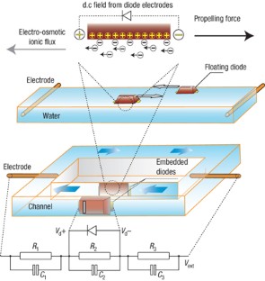 Microsensors and micromachines that are capable of self-propulsion through fluids could revolutionize many aspects of technology. Few principles to propel such devices and supply them with energy are known. Here, we show that various types of miniature semiconductor diodes floating in water act as self-propelling particles when powered by an external alternating electric field. The millimetre-sized diodes rectify the voltage induced between their electrodes. The resulting particle-localized electro-osmotic flow propels them in the direction of either the cathode or the anode, depending on their surface charge. These rudimentary self-propelling devices can emit light or respond to light and could be controlled by internal logic. Diodes embedded in the walls of microfluidic channels provide locally distributed pumping or mixing functions powered by a global external field. The combined application of a.c. and d.c. fields in such devices allows decoupling of the velocity of the particles and the liquid and could be used for on-chip separations.