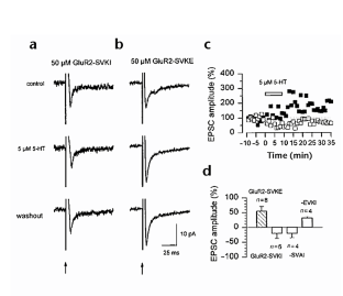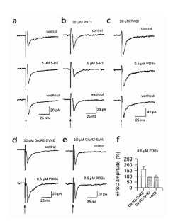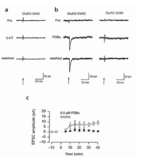 Silent synapses form between some primary sensory afferents and dorsal horn neurons in the spinal cord. Molecular mechanisms for activation or conversion of silent synapses to conducting synapses are unknown. Serotonin can trigger activation of silent synapses in dorsal horn neurons by recruiting AMPA receptors. AMPA-receptor subunits GluR2 and GluR3 interact via their cytoplasmic C termini with PDZ-domain-containing proteins such as GRIP (glutamate receptor interacting protein), but the functional significance of these interactions is unclear. Here we demonstrate that protein interactions involving the GluR2/3 C terminus are important for serotonin-induced activation of silent synapses in the spinal cord. Furthermore, PKC is a necessary and sufficient trigger for this activation. These results implicate AMPA receptor–PDZ interactions in mechanisms underlying sensory synaptic potentiation and provide insights into the pathogenesis of chronic pain.