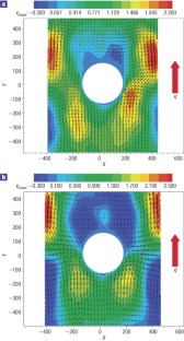 This file contains a video image of the particle motion around the cylinder at 2.03 K produced by an 11.2 kW/m2 steady heat current through the He II from below. This flux corresponds to a vortex line density of about 2.6 x 1010 m/m3 and an average line spacing of about 6.2 μm. The particles are 1.7 μm diameter polymer micro-spheres with a specific gravity of 1.1. (SWF 2665 kb)