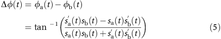 For a given signal s(t), with a Hilbert transform s′(t), the instantaneous phase difference φ(t) between two time series (labeled as a and b) is given by