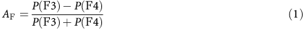 Frontal power asymmetry, AF, in the θ band was defined using channels F3 and F4 where