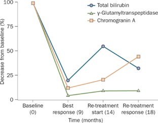 Management. Systemic treatment with oral capecitabine (1,500 mg/m2 daily from day 1 to day 21) and intravenous liposomal doxorubicin (10 mg/m2 on days 1, 8 and 15), both repeated every 4 weeks, administered concomitantly with long-acting octreotide 30 mg every 3 weeks. The patient achieved a significant and long-lasting response with the combination of capecitabine and liposomal doxorubicin. She reported no severe adverse effects.