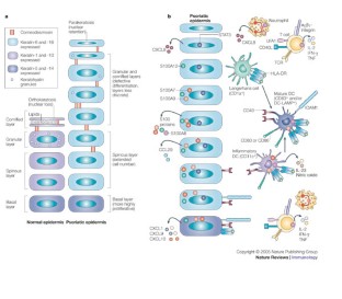 Psoriasis is an inflammatory disease of the skin that is mediated by T cells, dendritic cells (DCs), and a broad range of cytokines and chemokines. However, much of the clinical disease phenotype is caused by hyperplasia of epidermal keratinocytes, altered differentiation of these cells in a 'regenerative' pathway and increased growth of dermal blood vessels (causing thick, red, scaly plaques on the skin surface).