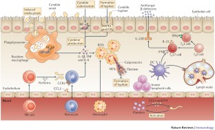 Neutrophils, monocytes and macrophages are the main immune cell populations responsible for host defence against systemic candidiasis, whereas T helper 1 (TH1) cells, TH17 cells and innate lymphoid cells are mainly responsible for protection against Candida infections at mucosal surfaces.