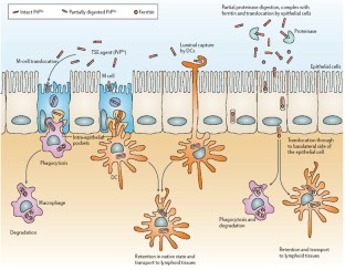 In vitro studies suggest that both M cells and intestinal epithelial cells could transfer prions across the epithelium from the intestinal lumen.