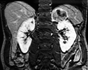 Management. En bloc surgical resection of kidney, suprarenal mass and spleen was performed, followed by initiation of mitotane chemotherapy 3 months later.