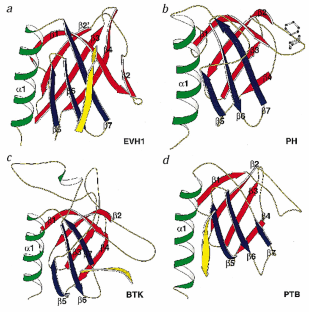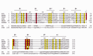 The Ena-VASP homology (EVH1) domain is a protein interaction module found in several proteins that are involved in transducing migratory and morphological signals into cytoskeletal reorganization. EVH1 specifically recognizes proline-rich sequences in its binding partners and directs the localization and formation of multicomponent assemblies involved in actin-based motile processes and neural development. The structure of the complex between an EVH1 domain and the target peptide sequence EFPPPPT identifies the interactions responsible for recognition and distinguishes it from other proline-rich binding modules, including SH3 and WW domains. Surprisingly, the EVH1 domain has structural similarity to pleckstrin homology (PH), phosphotyrosine-binding (PTB) and ran-binding (RanBD) domains.