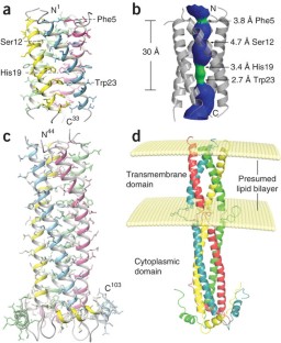 Wang, J., Kim, S., Kovacs, F. & Cross, T.A. Structure of the transmembrane region of the M2 protein H+ channel. Protein Sci. 10, 2241–2250 (2001).