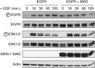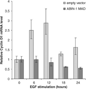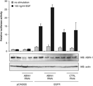 The epidermal growth factor receptor (EGFR) is frequently overexpressed in various tumours of epidermal origin and is held responsible for tumourigenicity and tumour persistence. Increased nuclear factor (NF)-κB activity has been suggested to be involved in the malignant behaviour of EGFR-overexpressing cells. However, the mechanisms that regulate EGF-induced NF-κB activation are still largely unknown. Here we show that EGF can induce NF-κB-dependent gene expression independently from IκBα degradation or p100 processing in EGFR-overexpressing HEK293T cells. Moreover, EGF-induced NF-κB activation could be inhibited by overexpression of ABINs, which were previously identified as intracellular inhibitors of tumour necrosis factor, interleukin-1 and lipopolysaccharide-induced NF-κB activation. Knockdown of ABIN-1 by RNA interference boosted the NF-κB response upon EGF stimulation. The C-terminal ubiquitin-binding domain containing region of ABINs was crucial and sufficient for NF-κB inhibition. Adenoviral gene transfer of ABINs reduced constitutive NF-κB activity as well as the proliferation of EGFR-overexpressing A431 and DU145 human carcinoma cells. Altogether, these results demonstrate an important role for an ABIN-sensitive non-classical NF-κB signalling pathway in the proliferation of EGFR-overexpressing tumour cells, and indicate a potential use for ABIN gene therapy in the treatment of cancer.
