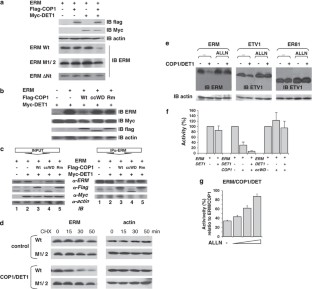 In this study, we report that the PEA3 group members interact with the mammalian really interesting new gene (RING) E3 ubiquitin ligase constitutive photomorphogenetic 1 (COP1), which mediates ubiquitylation and subsequent proteasome degradation of the p53 and c-Jun transcription factors. This interaction is mediated by the central region of COP1 including the coiled-coil domain and two COP1-interacting consensus motifs localized in the well-conserved N-terminal transactivation domain of the PEA3 group members. At the transcriptional level, COP1 reduces the transcriptional activity of ERM and the two other PEA3 group proteins on Ets-responsive reporter genes; this effect being dependent on the RING domain of COP1 and the two COP1-interacting motifs of ERM. Reduced transcriptional activity was, however, not related to COP1-induced changes in ERM stability. In fact, increased ubiquitylation and subsequent proteasome-mediated degradation of ERM is achieved only when COP1 is expressed with DET1, a key COP1 partner within the ubiquitylation complex. Conversely, we show that the depletion of COP1 or DET1 by small interference RNA (siRNA) in U2OS cells stabilizes endogenous ERM whereas only COP1 knockdown enhances expression of ICAM-1, a gene regulated by this transcription factor. These results indicate that COP1 is a complex regulator of ERM and the two other PEA3 group members.