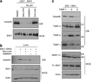 Paper contributions. SMC performed Vstat40 characterization, angiogenesis, cleavage site detection and furin/MMP-14 protease identification experiments, and SMC and EGVM wrote the manuscript. NSD, BK, EMS and SK performed Vstat40 and protease identification experiments. LC and JHS performed the survival analysis. Experiments were conceived of and planned by the respective authors under the direction of EGVM. We appreciate the helpful advice and assistance of all members of the Laboratory of Molecular Neuro-Oncology. SMC was in the Emory graduate program in Neuroscience and acknowledges project guidance by her thesis committee (Drs Randy Hall, Robert McKeon, Paula Vertino and Wei Zhou). We thank Dr C Dubois (Université de Sherbrooke) for the kind gift of LoVo cells. The US National Institutes of Health (R01 CA86335 to EGVM and contract 29XS193 to JHS), P30 CA138292 (to the Winship Cancer Institute) and the Emory Neurosciences Initiative (to EGVM) contributed to the funding of this research.