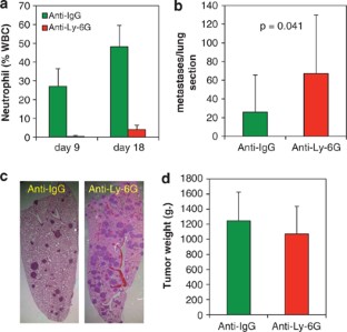 Kowanetz M, Wu X, Lee J, Tan M, Hagenbeek T, Qu X et al. Granulocyte-colony stimulating factor promotes lung metastasis through mobilization of Ly6G+Ly6C+ granulocytes. Proc Natl Acad Sci USA. 2010; 107: 21248–21255.