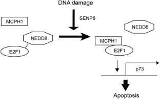 The transcription factor E2F1 has pivotal roles in both cell proliferation and cell death, and is an important molecular target in cancer. Under proliferative conditions E2F1 induces the expression of genes that promote cell cycle progression, such as E2F2, whereas under proapoptotic conditions E2F1 induces expression of genes such as p73 that lead to apoptosis. The mechanism by which the apoptotic function of E2F1 is activated remains unclear, however. We now show that members of the E2F family are covalently conjugated with the ubiquitin-like modifier NEDD8. Overexpression of SENP8, a NEDD8-specific cysteine protease, resulted in deNEDDylation of E2F1 and promoted its transactivation activity at the p73 gene but not at the E2F2 gene. Knockdown of SENP8, on the other hand, attenuated p73 expression and apoptosis induced by E2F1 or by DNA damage. SENP8 also promoted the interaction between E2F1 and its cofactor Microcephalin 1, which is required for p73 induction. These results suggest that NEDDylation is a molecular trigger that modifies the target specificity of E2F1, and could have important implications for E2F1 regulation of apoptosis.