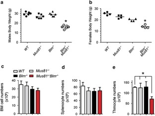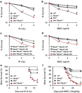 BLM is a DNA helicase important for the restart of stalled replication forks and for homologous recombination (HR) repair. Mutations of BLM lead to Bloom Syndrome, a rare autosomal recessive disorder characterized by elevated levels of sister chromatid exchanges (SCEs), dwarfism, immunodeficiency, infertility and increased cancer predisposition. BLM physically interacts with MUS81, an endonuclease involved in the restart of stalled replication forks and HR repair. Herein we report that loss of Mus81 in Blm hypomorph mutant mice leads to infertility, and growth and developmental defects that are not observed in single mutants. Double mutant cells and mice were hypersensitive to Mitomycin C and γ-irradiation (IR) compared with controls and their repair of DNA double-strand breaks (DSBs) mediated by HR pathway was significantly defective, whereas their non-homologous-end-joining repair was elevated compared with controls. We also demonstrate the importance of the loss of the nuclease activity of Mus81 in the defects observed in Mus81−/− and double mutant cells. Exacerbated IR-induced chromosomal aberration was observed in double mutant mice and despite their reduced SCE levels, these mutants showed increased tumorigenesis risks. Our data highlight the importance of Mus81 and Blm in DNA DSB repair pathways, fertility, development and cancer.