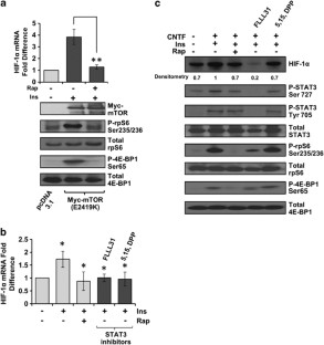 Recent clinical trials using rapalogues in tuberous sclerosis complex show regression in volume of typically vascularised tumours including angiomyolipomas and subependymal giant cell astrocytomas. By blocking mechanistic/mammalian target of rapamycin complex 1 (mTORC1) signalling, rapalogue efficacy is likely to occur, in part, through suppression of hypoxia-inducible factors (HIFs) and vascular endothelial growth factors (VEGFs). We show that rapamycin reduces HIF-1α protein levels, and to a lesser extent VEGF-A levels, in renal cystadenoma cells in a Tsc2+/− mouse model. We established that mTORC1 drives HIF-1α protein accumulation through enhanced transcription of HIF-1α mRNA, a process that is blocked by either inhibition or knockdown of signal transducer and activation of transcription 3 (STAT3). Furthermore, we demonstrated that STAT3 is directly phosphorylated by mTORC1 on Ser727 during hypoxia, promoting HIF-1α mRNA transcription. mTORC1 also regulates HIF-1α synthesis on a translational level via co-operative regulation of both initiation factor 4E-binding protein 1 (4E-BP1) and ribosomal protein S6 kinase-1 (S6K1), whereas HIF-1α degradation remains unaffected. We therefore proposed that mTORC1 drives HIF-1α synthesis in a multifaceted manner through 4E-BP1/eIF4E, S6K1 and STAT3. Interestingly, we observed a disconnect between HIF-1α protein levels and VEGF-A expression. Although both S6K1 and 4E-BP1 regulate HIF-1α translation, VEGF-A is primarily under the control of 4E-BP1/eIF4E. S6K1 inhibition reduces HIF-1α but not VEGF-A expression, suggesting that mTORC1 mediates VEGF-A expression via both HIF-1α-dependent and -independent mechanisms. Our work has important implications for the treatment of vascularised tumours, where mTORC1 acts as a central mediator of STAT3, HIF-1α, VEGF-A and angiogenesis via multiple signalling mechanisms.