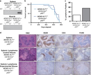 Alternative splicing of the oncogene murine double minute 2 (MDM2) is induced in response to genotoxic stress. MDM2-ALT1, the major splice variant generated, is known to activate the p53 pathway and impede full-length MDM2’s negative regulation of p53. Despite this perceptible tumor-suppressive role, MDM2-ALT1 is also associated with several cancers. Furthermore, expression of MDM2-ALT1 has been observed in aggressive metastatic disease in pediatric rhabdomyosarcoma (RMS), irrespective of histological subtype. Therefore, we generated a transgenic MDM2-ALT1 mouse model that would allow us to investigate the effects of this splice variant on the progression of tumorigenesis. Here we show that when MDM2-ALT1 is ubiquitously expressed in p53 null mice it leads to increased incidence of spindle cell sarcomas, including RMS. Our data provide evidence that constitutive MDM2-ALT1 expression is itself an oncogenic lesion that aggravates the tumorigenesis induced by p53 loss. On the contrary, when MDM2-ALT1 is expressed solely in B-cells in the presence of homozygous wild-type p53 it leads to significantly increased lymphomagenesis (56%) when compared with control mice (27%). However, this phenotype is observable only at later stages in life (⩾18 months). Moreover, flow cytometric analyses for B-cell markers revealed an MDM2-ALT1-associated decrease in the B-cell population of the spleens of these animals. Our data suggest that the B-cell loss is p53 dependent and is a response mounted to persistent MDM2-ALT1 expression in a wild-type p53 background. Overall, our findings highlight the importance of an MDM2 splice variant as a critical modifier of both p53-dependent and -independent tumorigenesis, underscoring the complexity of MDM2 posttranscriptional regulation in cancer. Furthermore, MDM2-ALT1-expressing p53 null mice represent a novel mouse model of fusion-negative RMS.