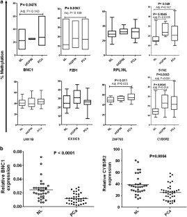 In all, we selected 33 promoter-associated novel CpG sites that were differentially methylated in high-grade prostatic intraepithelial neoplasia and PCa in comparison with benign prostate tissue samples (false discovery rate-adjusted P-value <0.05; β-value ⩾0.2; fold change >1.5). Of the 33 genes, hierarchical clustering analysis demonstrated BNC1, FZD1, RPL39L, SYN2, LMX1B, CXXC5, ZNF783 and CYB5R2 as top candidate novel genes that are frequently methylated and whose methylation was associated with inactivation of gene expression in PCa cell lines. Pathway analysis of the genes with altered methylation patterns identified the involvement of a cancer-related network of genes whose activity may be regulated by TP53, MYC, TNF, IL1 and 6, IFN-γ and FOS in prostate pathogenesis.