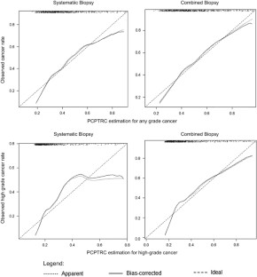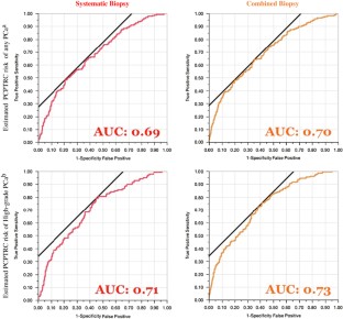 A review of a prospective cohort undergoing MRI and FBx/SBx was conducted. Data from consecutive FBx/SBx were collected between August 2007 and February 2014, and PCPTRC scores using the PCPTRC2.0R-code were calculated. The risk of positive biopsy and high-grade cancer (Gleason ⩾7) on biopsy was calculated and compared with overall and high-grade cancer detection rates (CDRs). Receiver operating characteristic curves were generated and the areas under the curves (AUCs) were compared using DeLong’s test.