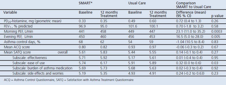 Table 2 Efficacy outcomes at the start and after 12 months of treatment in the SMART (* Budesonide/formoterol maintenance and reliever therapy) and Usual Care groups and efficacy outcomes of SMART compared with Usual Care after 12 months of treatment