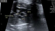 ABSTRACT: Maximum flow velocity waveforms were recorded in a longitudinal study from the fetal ascending aorta and fetal pulmonary artery in 46 normal pregnancies and, in addition, from the umbilical artery in 21 cases of intrauterine growth retardation between 19 and 33 wk gestation. In normal pregnancy, the mean peak systolic velocity (PSV) in the ascending aorta increased from 49.4 cm/s at 19 wk of gestation to 79.0 cm/s at 33 wk of gestation. The corresponding increase in PSV in the pulmonary artery was from 39.0 to 63.7 cm/s. The ratio for the PSV between the two arteries remained constant (1.25-1.29). Mean values of PSV in both arteries were linearly related to gestational age. Normal limits according to age were constructed by establishing the 5th and 95th percentiles. In intrauterine growth retardation, the PSV in the pulmonary artery was decreased (<5th percentile) in 95% of cases, PSV in the ascending aorta was reduced (<5th percentile) in only 57%. No relationship was established between PSV in both arteries and the presence or absence of end-diastolic flow velocities in the umbilical artery. The outcome of fetuses with intrauterine growth retardation, as expressed by Apgar score at 1 min and umbilical cord pH, bears no relationship to the PSV in ascending aorta and pulmonary artery.