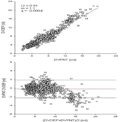 Results: We analysed a total of 602 breaths at 0 cmH2O, 523 at 4 cmH2O, and 150 at 8 cmH2O. The mean difference between DVOEP and DVPNT for all newborns was -0.45±3.92% of Vt at 0 cm H2O, -4.25±9.04% at 4 cmH2O and -8.31±3.87% at 8 cmH2O. Pooling data points from all infants and all pressure levels, Bland-Altman and linear regression analysis showed good agreement between the two measurement techniques (see Fig).